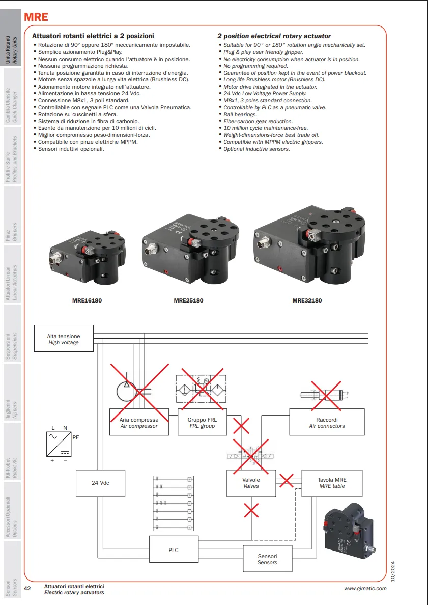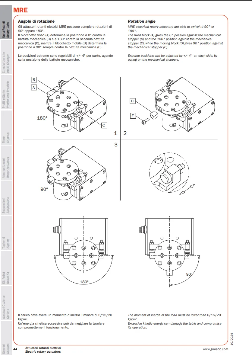 MRE là thiết bị của Gimatic được sử dụng trong các đơn vị quay của hệ thống tự động hóa. Dòng đơn vị quay điện này thực hiện chuyển động quay hai vị trí với góc quay có thể điều chỉnh cơ khí 90° hoặc 180°.