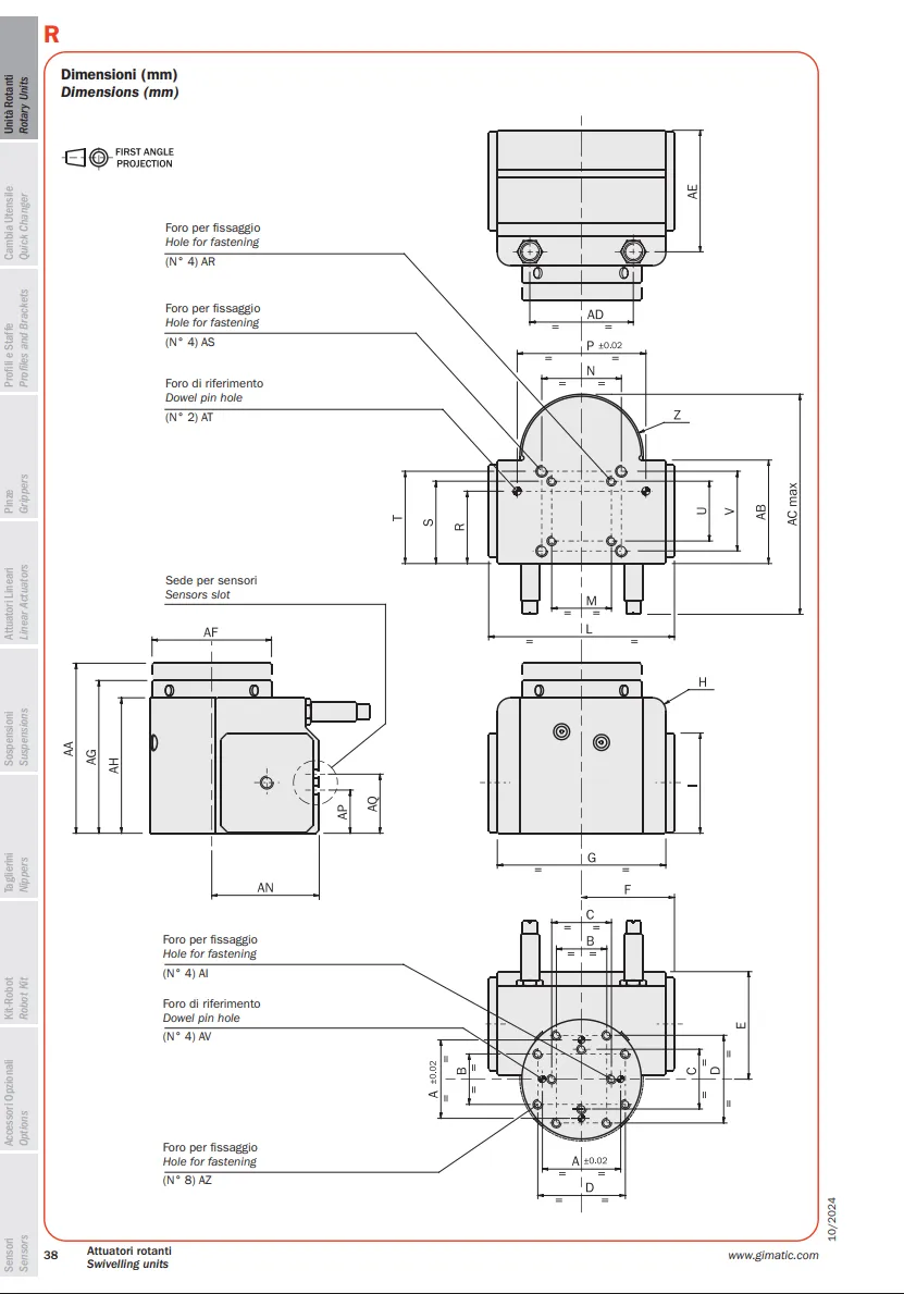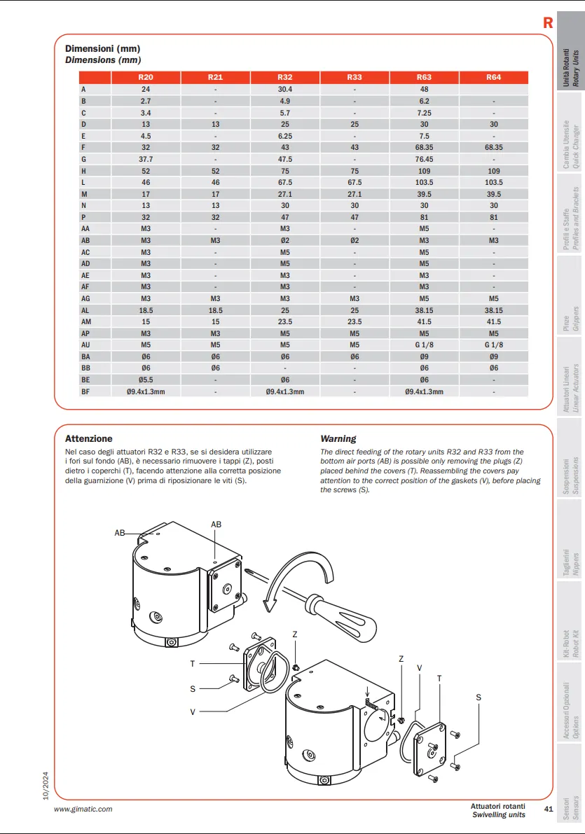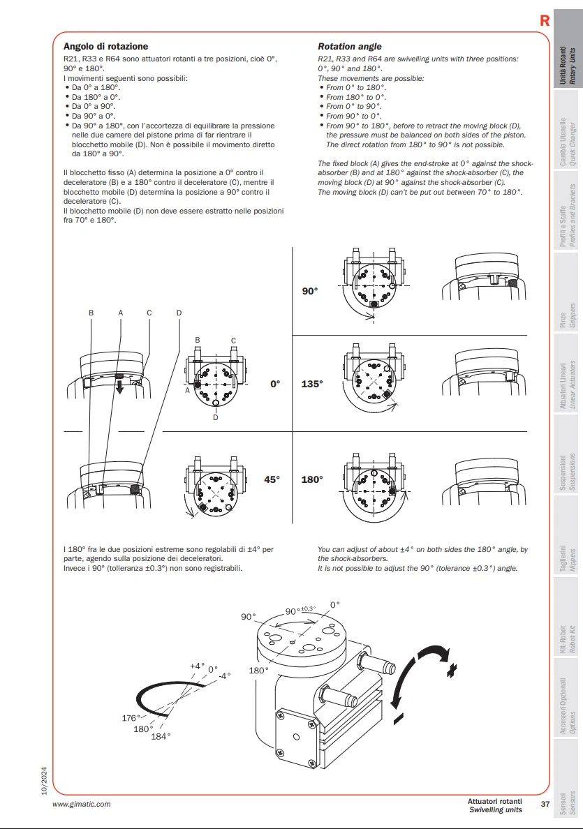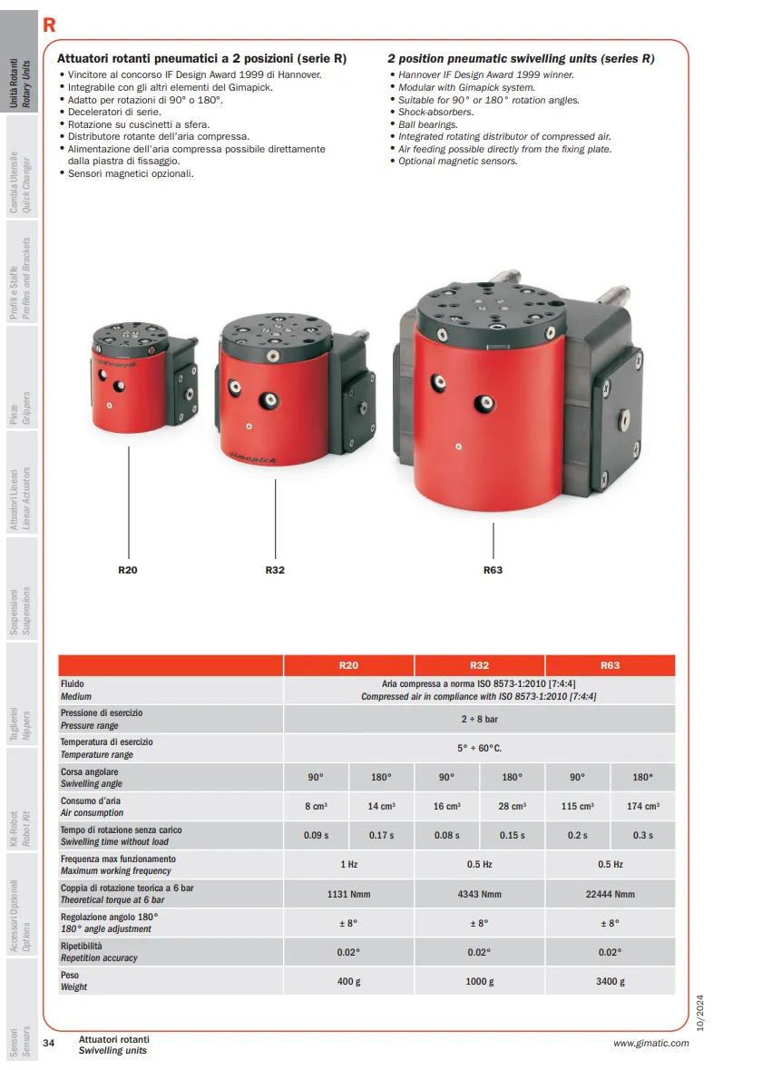 R là thiết bị của Gimatic được sử dụng trong các đơn vị quay phục vụ robot và hệ thống tự động hóa. Dòng đơn vị quay khí nén này thực hiện chuyển động quay hai vị trí với các góc quay 90° hoặc 180°.