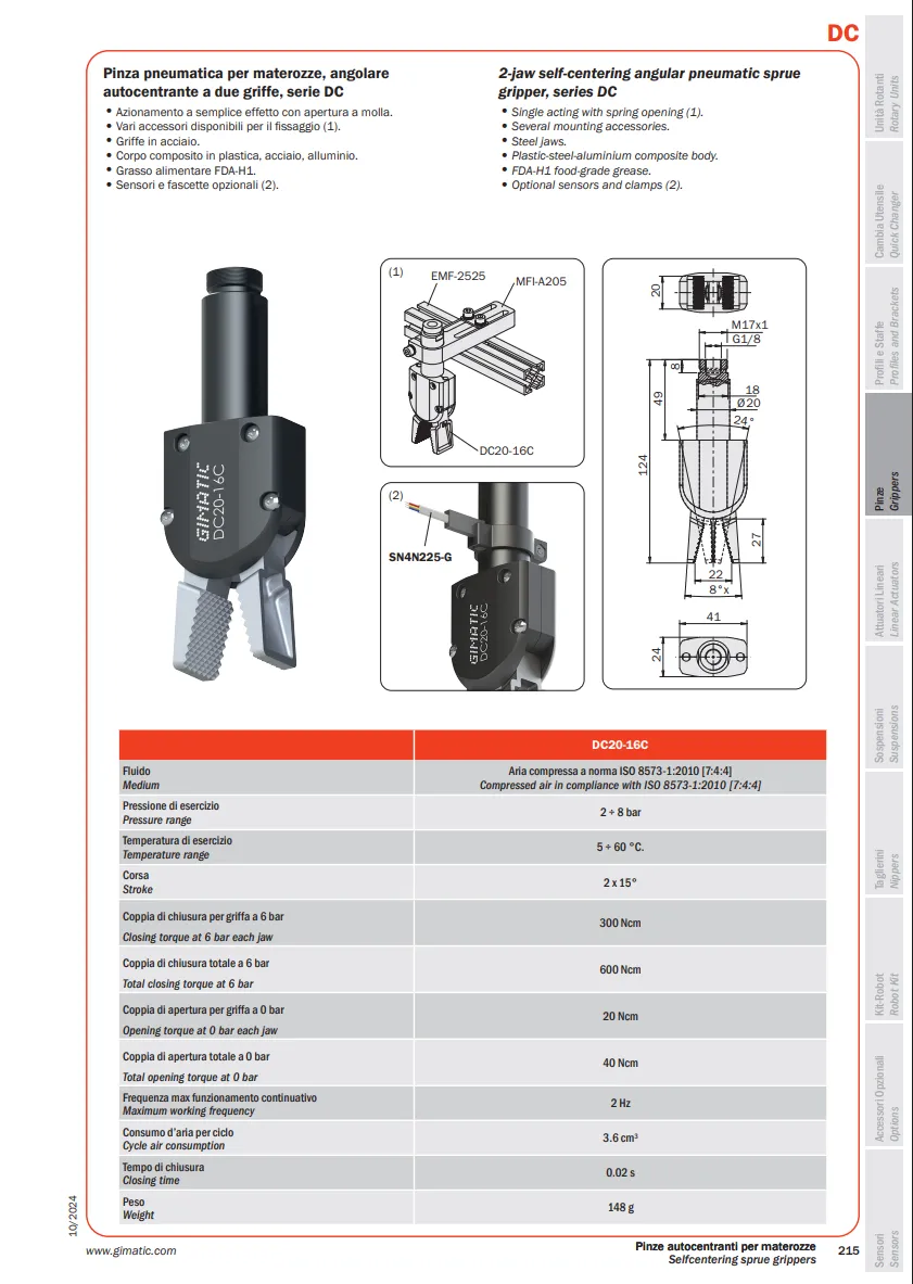 DC là dòng kẹp góc thuộc danh mục kẹp của Gimatic, được sử dụng trong các hệ thống robot và dây chuyền tự động hóa, với cơ cấu chuyển động mở dạng xoay và ứng dụng trong gắp cuống nhựa (sprue).